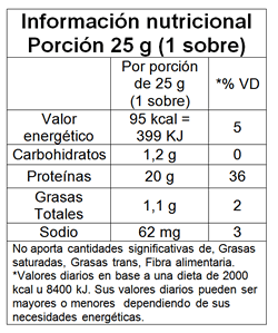 PURA PROTEÍNA DE SUERO LÁCTEO EN SOBRES CON DOSIS INDIVIDUALES DE 25 g, PARA PREPARAR EXQUISITOS BATIDOS PROTÉICOS CON MUY BAJO (PRÁCTICAMENTE NULO) CONTENIDO DE CARBOHIDRATOS Y GRASA.